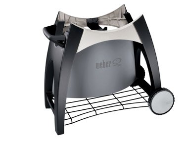 - Metal and heavy-duty plastic stationary cart for Weber Q portable grill- Wire bottom shelf provides storage space for tools and equipment